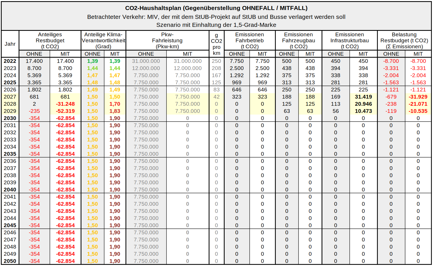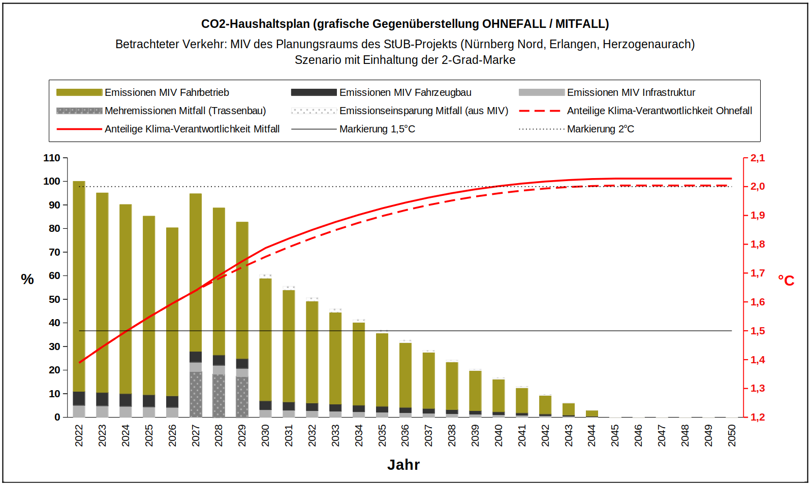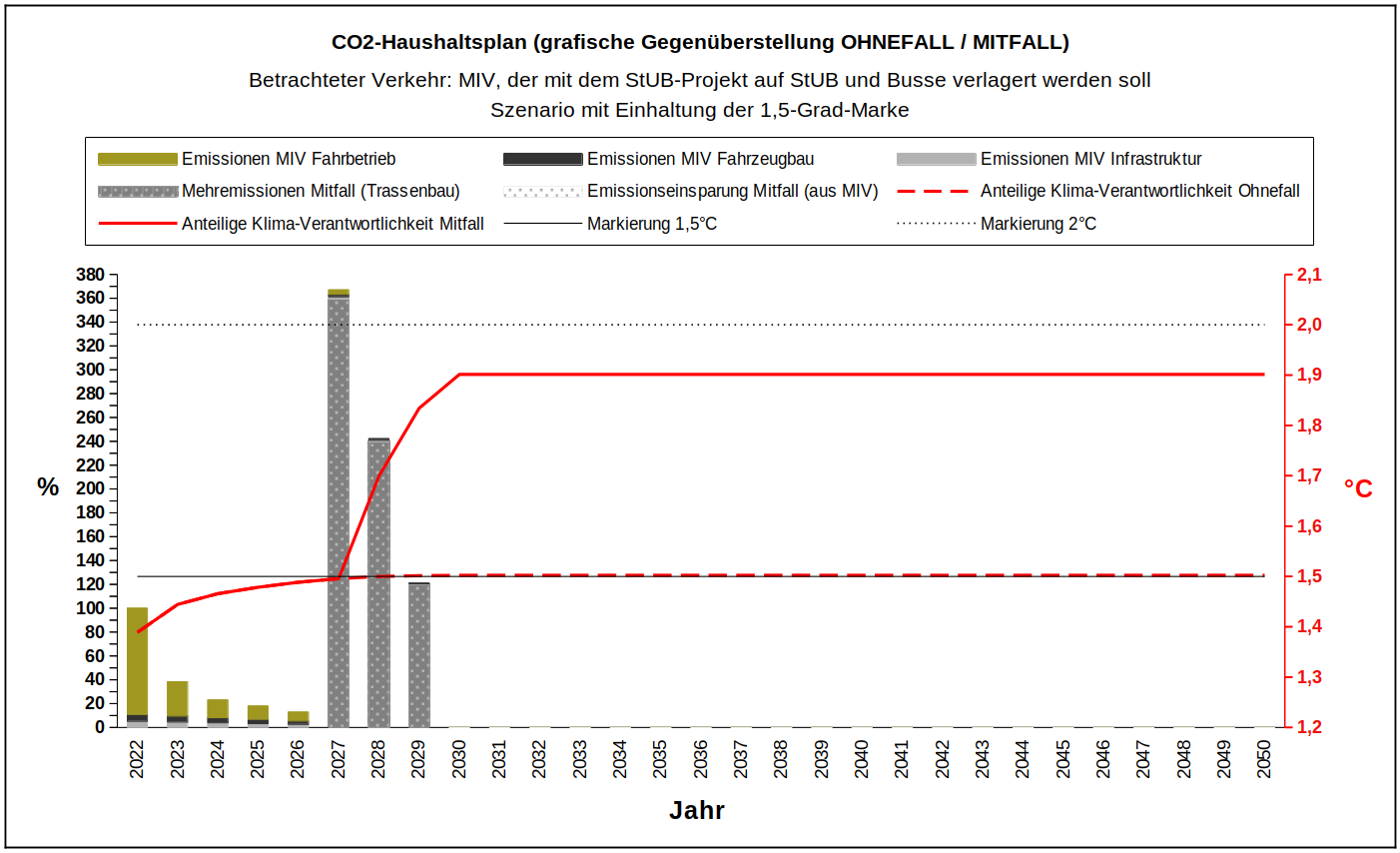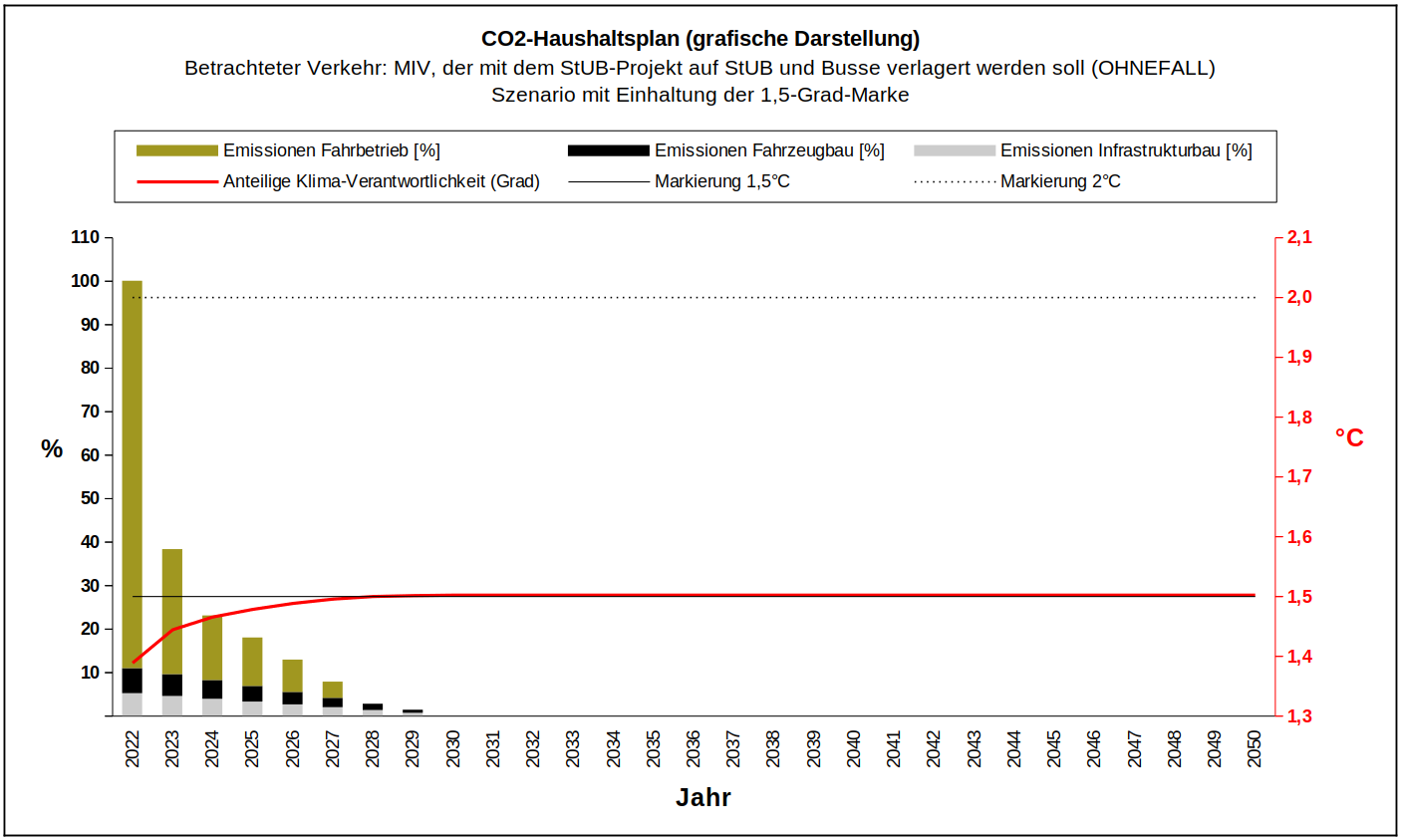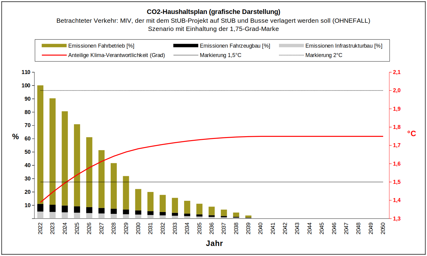1,75-Grad-Marke: 2028 wird das StUB-Projekt vielleicht im Bau sein, amortisiert haben wird es sich noch nicht, denn es wurde noch nicht in Betrieb genommen. Damit gilt das Gleiche wie für das 1,5-Grad-Ziel: das StUB-Projekt sollte möglichst keine Baustellenemissionen verursachen.