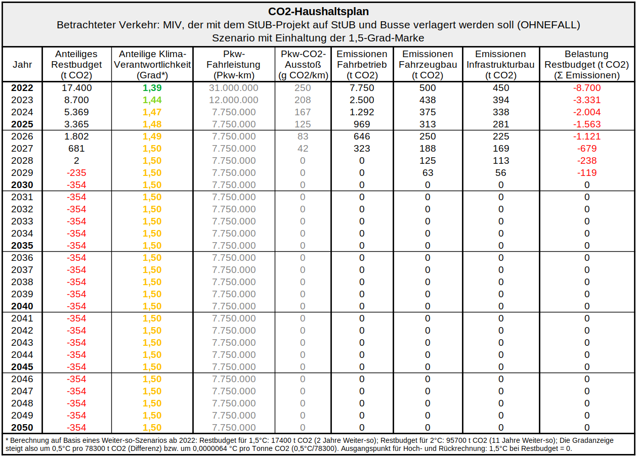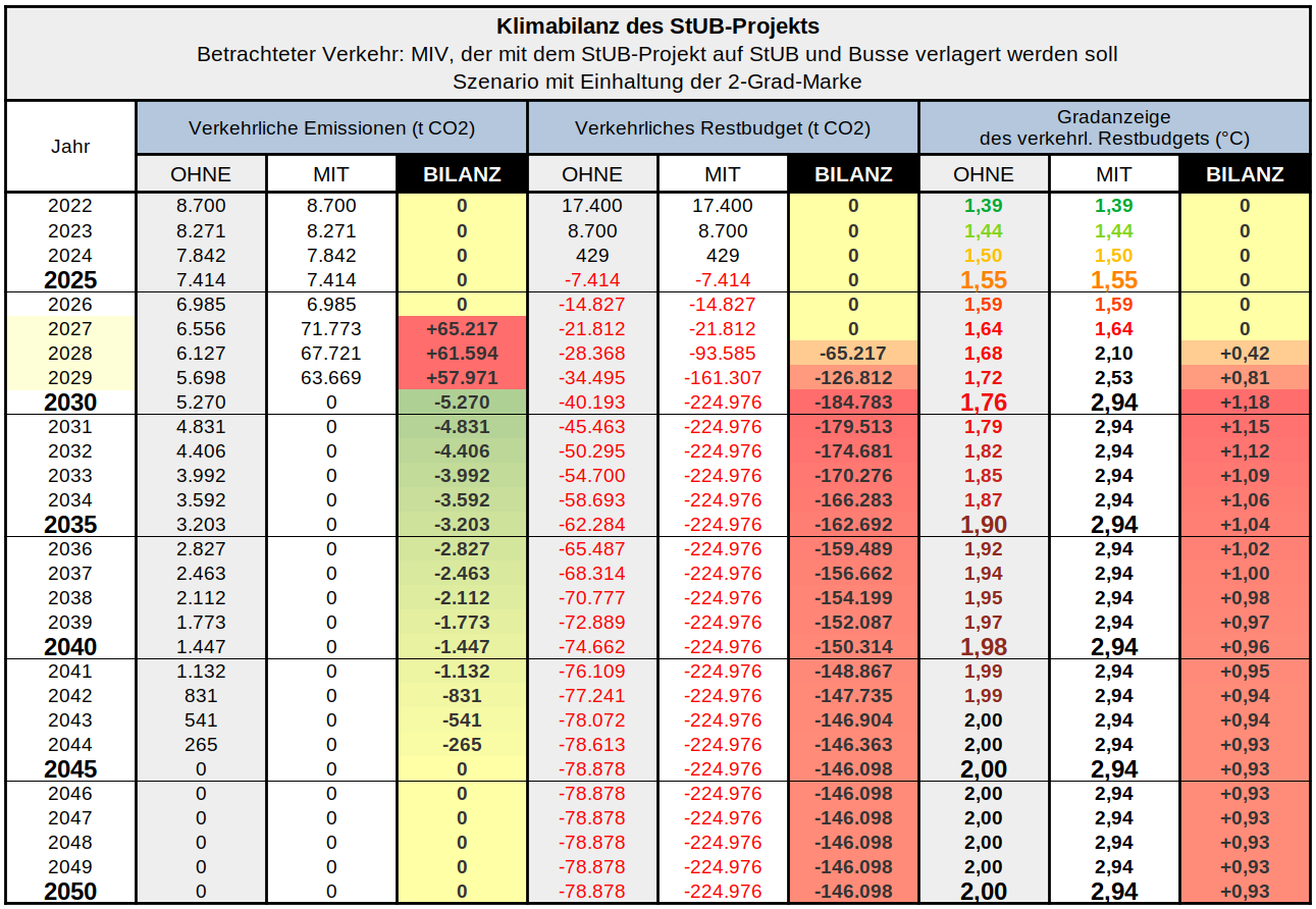 eine Klimabilanz unter Berücksichtigung der Baustellenemissionen und des Restbudgetansatzes für das StUB-Projekt aufstellen (Forderungen 3 - 5). Sinnvollerweise muss hier eine neue Forderung nach einem CO2-Haushaltsplan für den restlichen Verkehr im Planungsraum ergänzt werden (“Klimamobilitätsplan”): Die StUB muss Teil eines Gesamtkonzepts werden, das mit den Pariser Klimazielen vereinbar ist.⁽²⁾