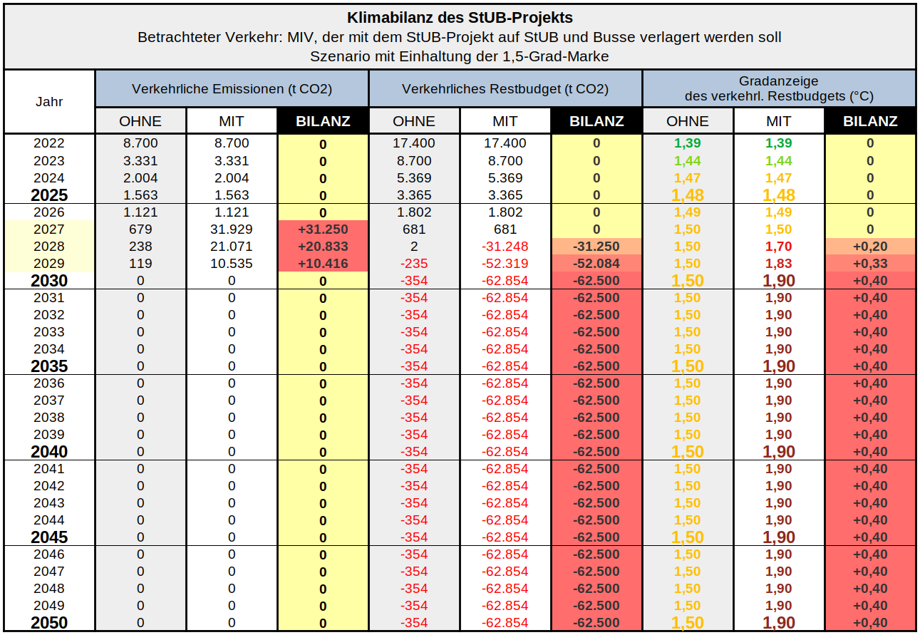 1,5-Grad-Ziel: Bis 2024 ist das StUB-Projekt weder im Bau, noch wird es sich amortisiert haben. Wenn das 1,5-Grad-Ziel im Verkehr eingehalten werden soll, dann also zunächst ohne StUB: Der Verkehr muss weitgehend klimaneutral werden, bevor das StUB-Projekt in Betrieb geht. Um in dieses Szenario zu passen, müsste das StUB-Projekt im Wesentlichen klimaneutral gebaut werden bzw. die gesamten Baustellenemissionen müssten an anderer Stelle kompensiert werden. Oberste Priorität beim Bau müsste also sein, möglichst keine Baustellenemissionen zu verursachen.